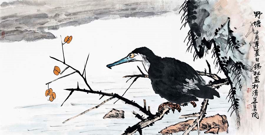 潘锡林先生兼容徐渭、八大山人、任伯年和吴昌硕等诸家之长,他画鸟的时候,眼睛会画的很大,炯炯有神,直接取自于八大山人的表现方式,但又不落窠臼,从吴昌硕先生的石鼓文里学到书法的线条入画!学习潘天寿先生的构成与框架,但又有自己独到的理念和创意。潘锡林先生说:“对于先贤作品的吸收与借鉴,首先要临摹,多下功夫,一个画家到了一定的阶段,学养、阅历,达不到一定的高度,绘画高度也上不去,心里想表达的,却表现不出来,就是功力不够,学养不够。同时,加强书法的练习,书法上不去,书画作品的线条就难以达到老辣、洗练,格调难以支撑”。大写意花鸟画家潘锡林先生的作品以书写入画,表现出:写为上,画为中,描为下的创作理念,表达自己的写意情感,抒发自己大写意的激情。 “人有正大气象,做人要堂堂正正,人品要高于艺品,你的绘画才会出现正大气象。”这正是潘锡林先生的从艺之本!