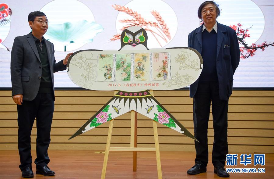 中国邮政发行《春夏秋冬》特种邮票 3月20日,在天津财经大学的活动现场,作家冯骥才(右)出席《春夏秋冬》特种邮票揭幕活动。当日是二十四节气中的春分。中国邮政发行《春夏秋冬》特种邮票一套4枚,图案内容分别为“春燕剪柳”“夏荷戏水”“秋鸡鸣穗”和“冬雪映梅”,全套邮票面值为5.40元。
