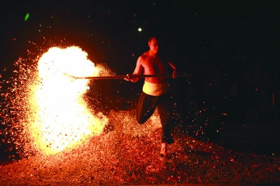 6月12日晚,在磐安县双峰乡的文化广场上,100多篮木炭,燃起直径10米的火坛,18名大汉赤膊光脚,手持铲子围着一大堆烧得通红的木炭奔走穿梭。火坛外,观众激昂喝彩,共祈福瑞。现场的喝彩声、欢呼声、惊叹声不绝于耳。